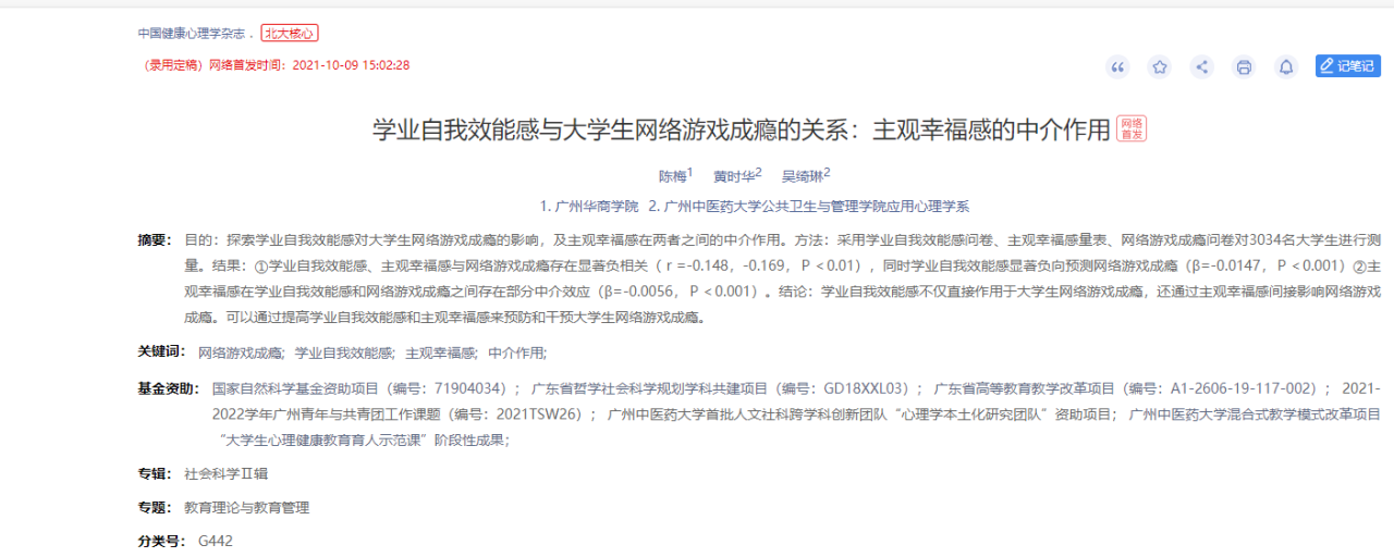 陈梅老师在《学业自我效能感与大学生网络游戏成瘾的关系:主观幸福感的中介作用》一文中探索学业自我效能感对大学生网络游戏成瘾的影响,及主观幸福感在两者之间的中介作用。