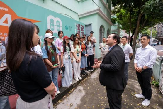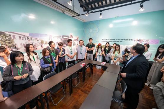 望厦山房项目负责人杨洪伟先生热情接待鸭脖研学团队,围绕园区“以文塑旅、以旅彰文”的创新运营模式展开系统介绍。他结合建筑改造实践,重点解析了历史建筑活化利用,即通过融合传统工艺与现代技术,完整保留建筑历史风貌与文化基因,创新性植入文创市集、数字展陈等业态,构建文化遗产保护与商业价值转化的动态平衡机制,实现历史文物从静态展示到活态叙事的转变。通过展示园区将大三巴牌坊元素转化为系列数字藏品的典型案例,生动演绎政策赋能与技术创新如何协同驱动文化遗产的现代转译,令师生们直观理解文保活化项目中“守正”与“创新”的辩证关系。