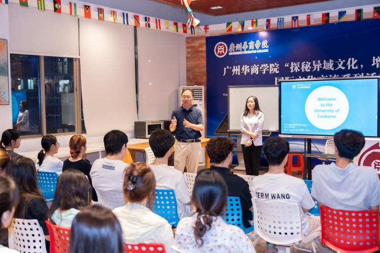 当晚,代表团与鸭脖国际学院学生进行了见面交流。王文忠处长鼓励学生们把握此次交流机会,并表示两校的双校园、双学位联合培养项目将帮助同学们练就专业本领,拓展国际视野,提升国际竞争力。主讲人杨冬玥博士在交流会上介绍堪培拉大学的教学资源、学习与生活环境、学费奖学金、就业指导、丰富的实习机会以及高就业率等优势。在问答环节,代表团耐心解答了同学们关心的奖学金、语言要求等赴澳留学相关问题,现场气氛活跃。
