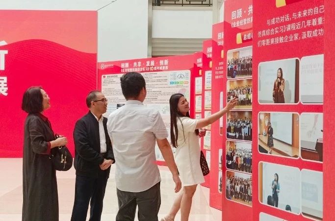 在董事长和校领导的关心和支持下,课程取得了广东省教学成果奖一等奖、广东省线下一流本科课程等一系列可喜成绩。展览的现场,一系列丰富多样的展板陈列在图书馆大厅,内容丰富,形式多样,全面回顾《企业经营仿真综合实习》10年的发展历程、教学理念和数字化教学取得的创新成果。