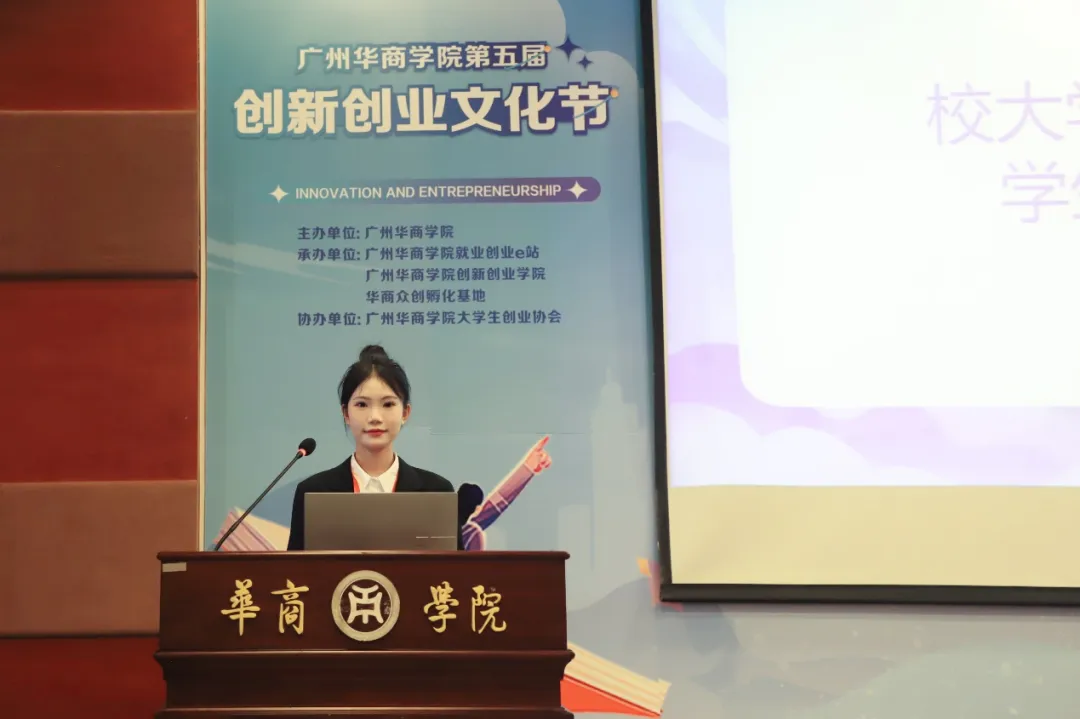 yabo鸭脖官网大学生创业协会学生骨干陈小冰发言,陈小冰同学总结回顾往届活动的风采,向关心支持校大学生创业协会发展的各位领导、老师、同学表示衷心的感谢,并承诺协会将继续不忘初心、开拓创新,以高质量、高标准来办好文化节系列活动,希望各位领导、老师、同学共同关注,积极参与其中。