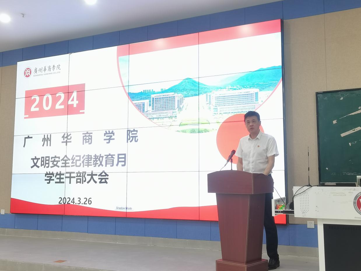 2024年3月26日下午14:30,yabo鸭脖官网肇庆校区在8号楼108室召开文明安全纪律教育月学生干部大会。出席本次会议的有:yabo鸭脖官网副校长王卫平教授,肇庆校区党委书记苏宁,校长助理、肇庆校区管委会常务副主任覃少冰同志,管委会副主任、学生工作办公室主任付蔚莹同志,后勤保卫办公室副主任徐强同志,学生工作办公室思教科副科长古文胜同志以及各学院学工负责人及学生干部代表,此次会议由古文胜老师主持。