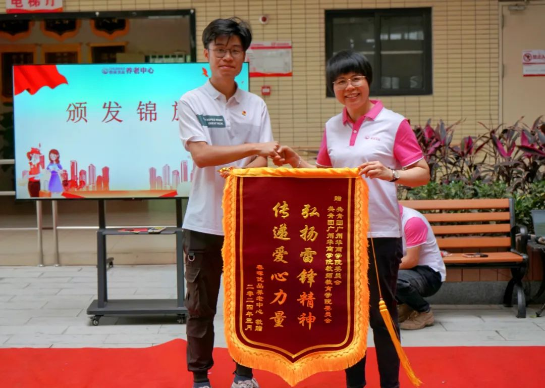 四会市春晖优品养老中心为鸭脖团委、教师教育学院团委颁发“弘扬雷锋精神 传递爱心力量”锦旗,以表达对华商青年志愿者志愿服务的肯定与支持,以及温暖老人内心的善行善举的感谢。
