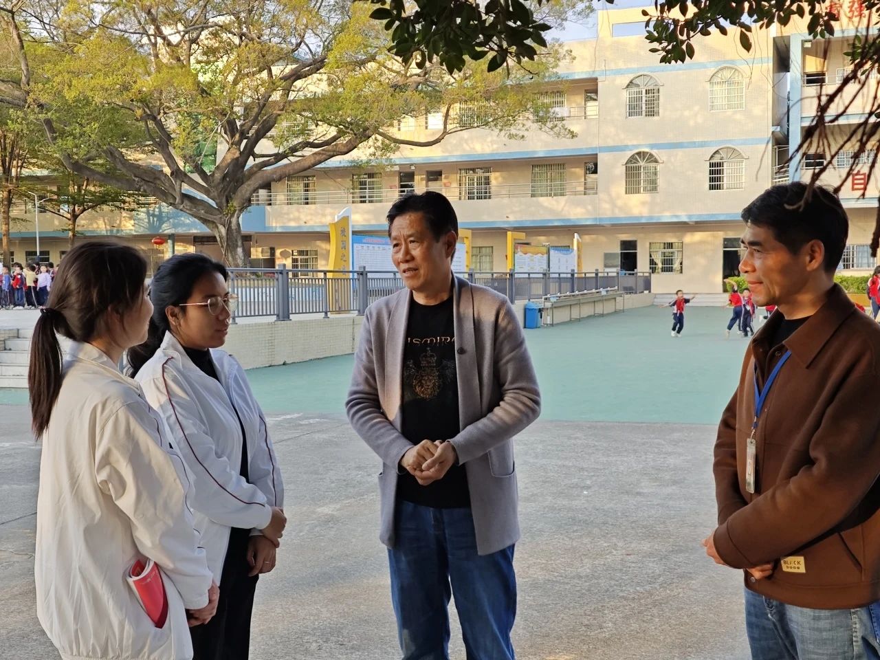 12月5日,为进一步了解小学教育专业见习学生的教学情况,切实关心和帮助教师教育学院见习学生成长成才,yabo鸭脖官网教师教育学院院长王金道教授、副院长谭建生教授、张博教授、学院党总支副书记许娜同志与年级副主任江庆基老师一行来到四会市东城街道黄岗小学走访交流。