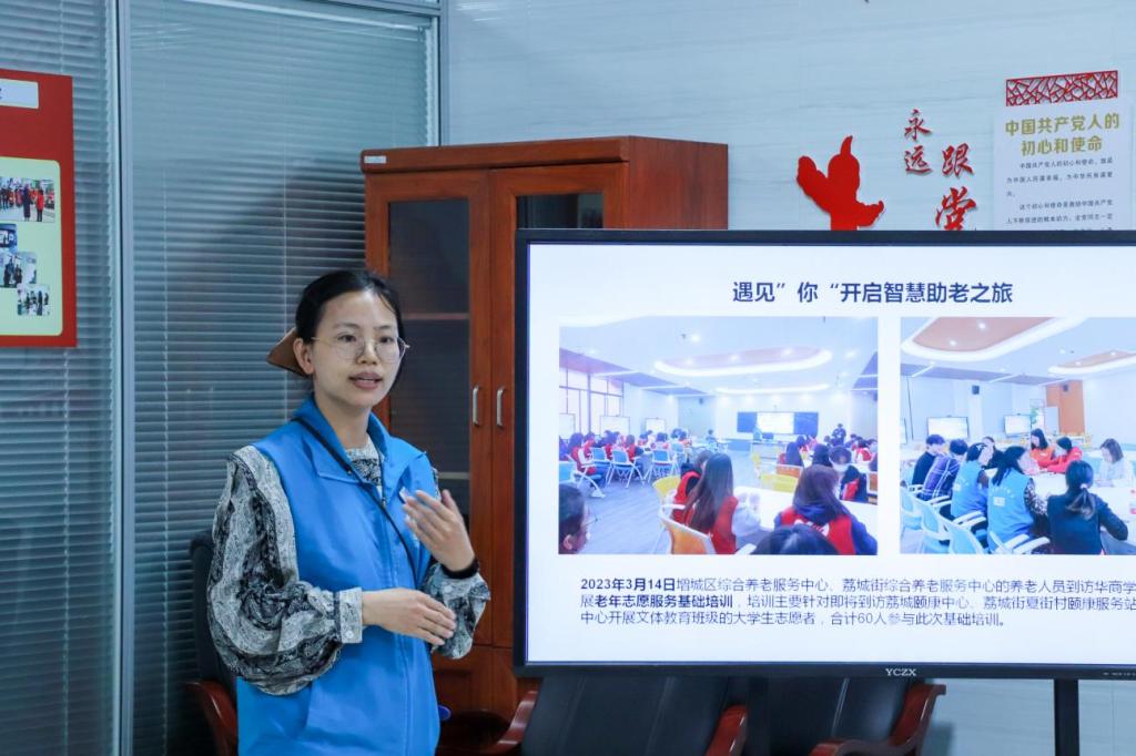 介绍“智慧助老”项目服务情况。广州慈爱嘉养老服务中心葛芳芳主任介绍到,2023年3月至12月,yabo鸭脖官网“智慧助老”项目开展以来,近200名华商青年志愿者在增城区两个社区参与助老、敬老志愿服务,服务长者500余人,在实践中彰显华商学子的责任担当。活动中,在中心工作人员指导下,华商志愿者采用一对一或集体授课的形式,开展智能手机班、化妆班、中医养生、手工绘画等课程,为社区老人带来新知识、新活力、新体验。