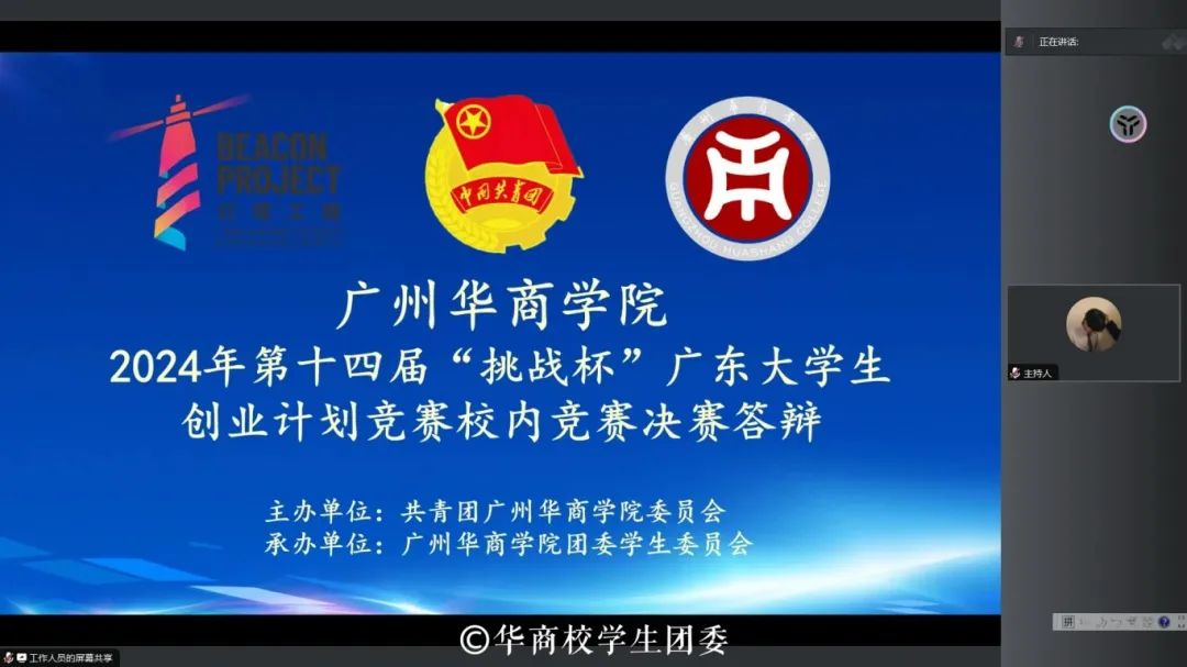 为深入学习宣传贯彻党的二十大精神,落实省委“百千万工程”重大战略部署,动员广大华商学子为推动广东高质量发展贡献智慧,以创业计划挑战竞赛为平台,带动学生将科技创新投身于创新创业事业,激发创新意识,将“所想”转化“所为”,2月18日18:30,在学校党委的领导下,鸭脖团委在腾讯会议组织开展第十四届“挑战杯”广东大学生创业计划竞赛校赛决赛。