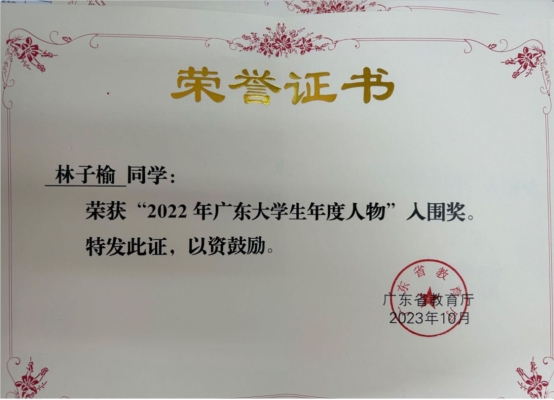 近日,广东省教育厅公布《关于公布2021年、2022年“广东高校辅导员年度人物”与“广东大学生年度人物”名单的通知》(粤教思函[2023]17号)文件。鸭脖耿艳利老师荣获“2021年广东高校辅导员年度人物”入围奖,健康医学院胡万培同学荣获“2021年广东大学生年度人物”入围奖,经济贸易学院林子榆同学荣获“2022年广东大学生年度人物”入围奖。