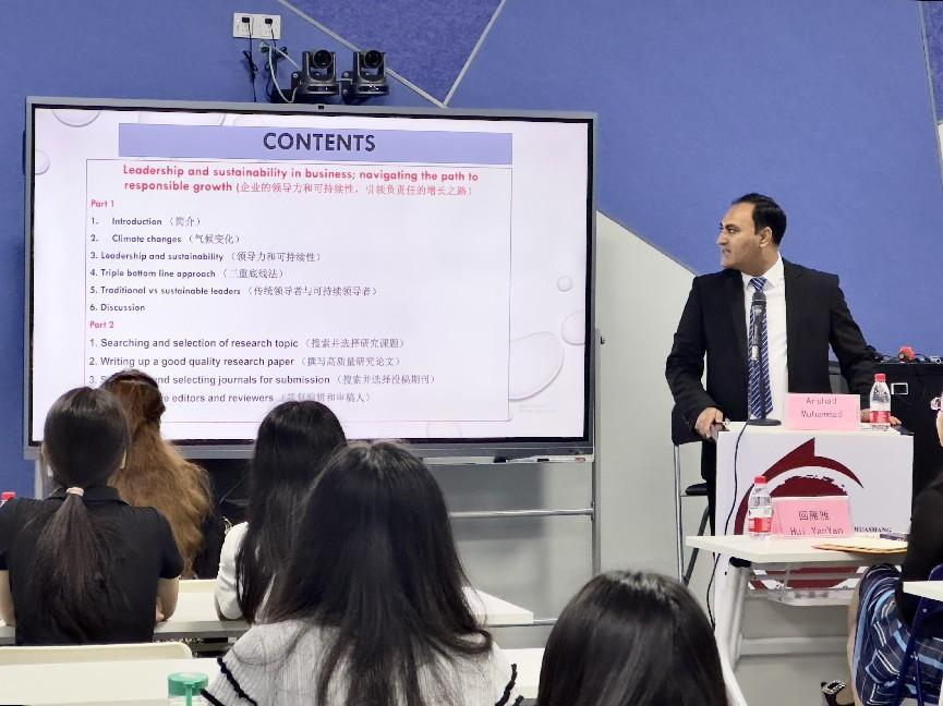 为拓宽大学生的国际视野,了解管理学和领导科学的最新研究成果,2023年11月8日,国际学院在启智楼401举行主题为“Leadership and sustainability in business:navigating the path to responsible growth”(企业的领导力和可持续性:引领负责任的增长之路)的文化素质讲座。巴基斯坦籍Arshad Muhammad博士担任主讲嘉宾,yabo鸭脖官网国际学院院长回雁雁、巴基斯坦籍教师Aneela Qadir博士、国际学院ACCA专员姚晓敏以及来自国际学院、健康医学院、管理学院、外国语学院、文学院、数据与科学学院的30多名大学生现场聆听了讲座。