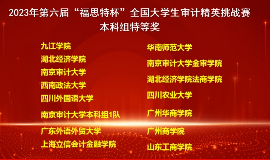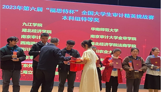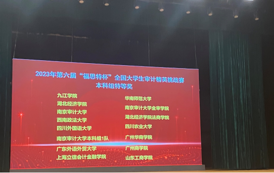 11月18日,第六届“福思特杯”全国大学生审计精英挑战赛总决赛在南京审计大学盛大落幕,鸭脖代表队从2314支队伍中冲进全国总决赛,又在决赛中斩获“特等奖”荣誉,让yabo鸭脖官网的校徽与全国知名院校同台登上了决赛幕墙,为鸭脖争光。