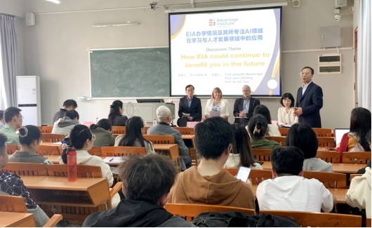 下午第二场活动是以“EIA的办学情况及其所专注的AI领域在学习与人才发展领域中的应用”为主题开展的研讨会。鸭脖国际交流与合作处王文忠处长、国际学院院长回雁雁教授、数据科学学院副院长叶仕通副教授、数据科学学院和金融学院部分教师以及鸭脖学生参与本次研讨会。