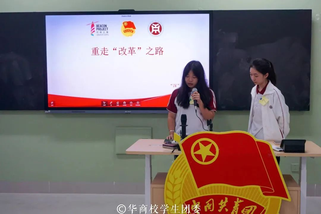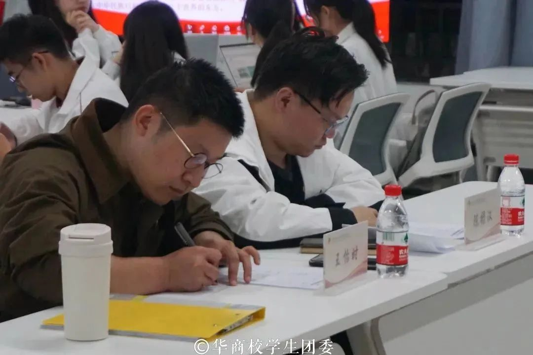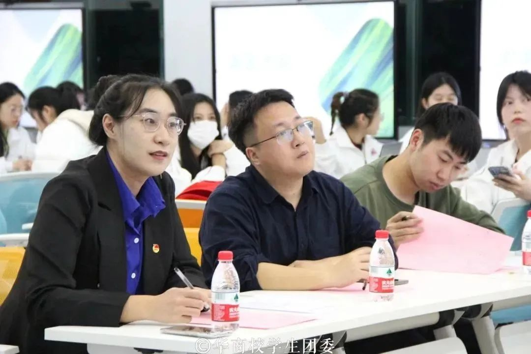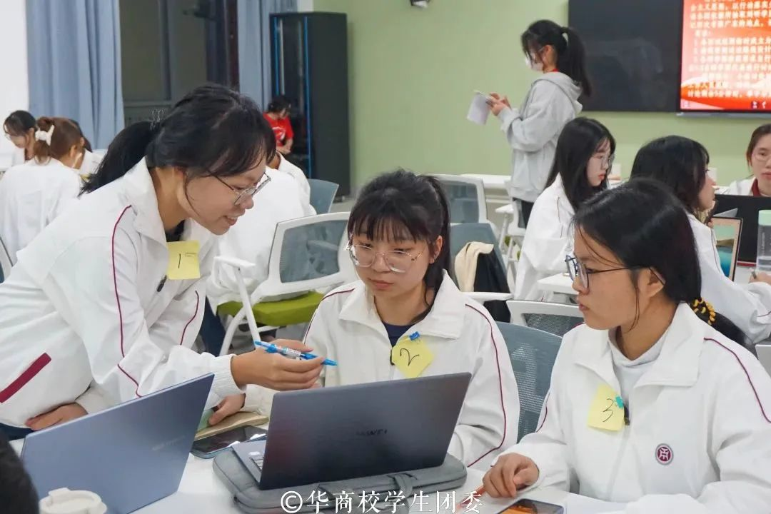 小组讨论总结汇报环节中,同学们积极上台演讲,展示小组讨论的成果。他们呼吁华商青年擦亮奋斗底色,续写时代华章,当好党的二十大精神的积极传播者和忠实践行者,以自信乐观的态度为老师、为同学服务;并将理论精神付诸于实践,在积极奉献中实现个人价值,砥砺自身品格,增长自身本领。
