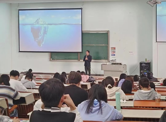 赵中宝老师给同学们提供了一个关于产品清楚的服务的逻辑闭环,这样有助于破开创业创新的层层壁垒,找到解决方案和精准定位下的客户。他由一张耳熟能详的冰山理论图,鼓励同学们发现自己水面下的价值和能量,以此来呼应讲座主题:“大学生创新创业的实践价值”。赵中宝老师认为,同学们作为大学生可以多尝试,允许自己试错,以创新创业为切入口,寻找属于自己的确定性。