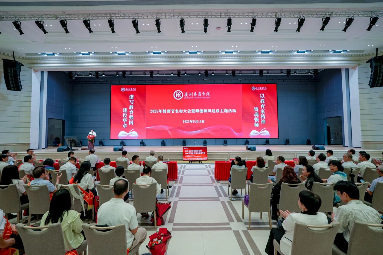为大力弘扬教育家精神,提升全校教师立德树人的使命感、责任感和荣誉感,2025年9月10日下午,yabo鸭脖官网2025年教师节表彰大会暨师德师风建设主题活动在广州校区新国际会议中心大礼堂举行。本次活动以“以教育家精神铸魂强师,谱写教育强国建设华章”为主题,集团领导、学校领导、学校顾问,全体中层干部、受表彰教职工、教师代表及学生代表齐聚一堂,共同致敬教育工作者,共话学校教育事业发展新蓝图。大会由副校长范忠宝主持。