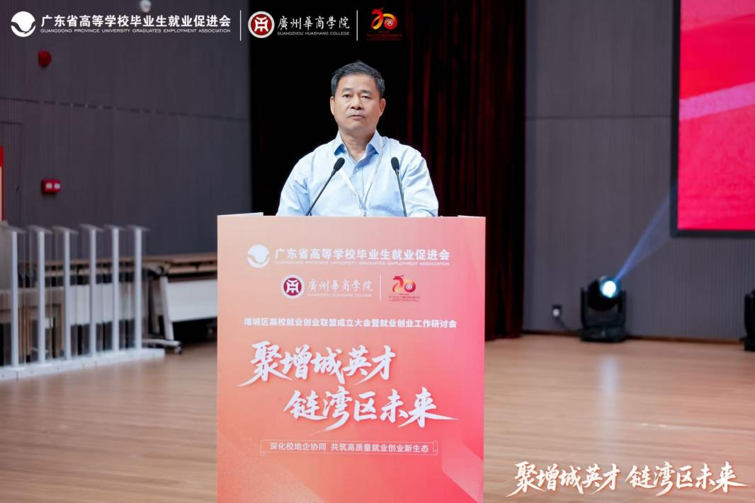 胡军校长代表联盟牵头单位致欢迎辞。他表示,联盟的组建是对国家人才强国战略与创新驱动发展理念的积极响应,联盟将通过构建“政校行企”四方联动的协同机制,打通信息壁垒,促进教育链、人才链、产业链、创新链的有机衔接。他强调,联盟不仅是促进毕业生更高质量、更充分就业的关键举措,更是为增城区乃至粤港澳大湾区的经济社会发展注入可持续人才动力的重要布局。