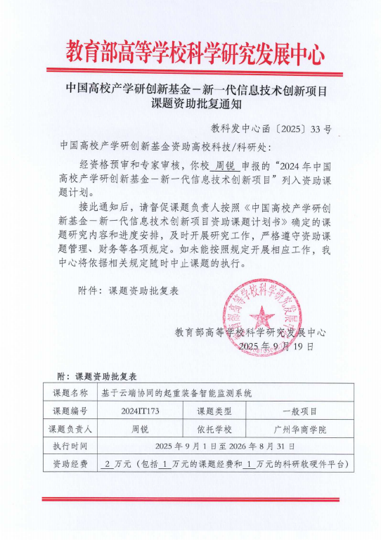 近日,由人工智能学院周锐科研团队申报的中国高校产学研创新基金—新一代信息技术创新项目“基于云端协同的起重装备智能监测系统”正式获批立项。该项目由教育部高等学校科学研究发展中心批准立项,是鸭脖首次获批此类基金项目。