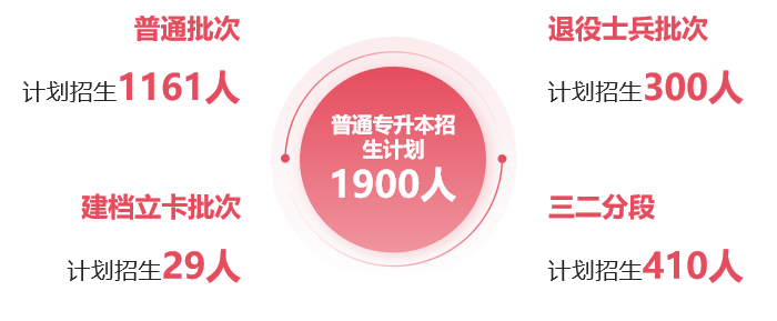 2025年省教育厅下达鸭脖普通专升本招生计划共1900人,其中,普通批次招生计划1161人、建档立卡批次招生计划29人、退役士兵批次招生计划300人、三二分段招生计划410人。