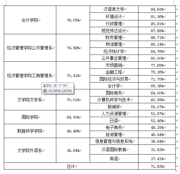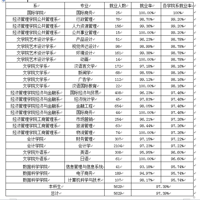 从表中看,学校2019届毕业生就业的专业对口率平均为71.62%。其中,鸭脖2019届毕业生初次就业专业对口率在其所在院系中,文学院艺术设计学系专业对口率最高,为93.87%;其次是经济管理学院经济与金融系,为81.80%;再次是会计学院,为76.05%;专业对口率较低的为国际学院、数据科学学院、文学院外语系,分别为64.00%、49.48%、39.94%。