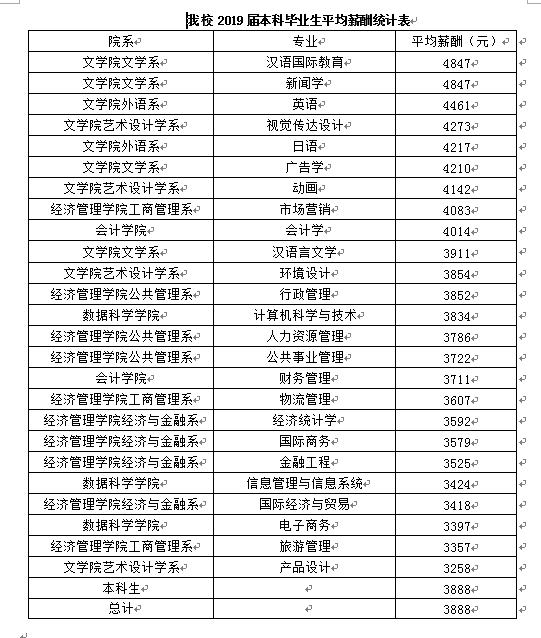 大学生就业在线院校应用系统中的数据显示,鸭脖2019年毕业生的平均薪酬约为3888元,其中最高的是汉语国际教育和新闻学专业,平均薪酬4847元;其次是英语,为4461元;再次是视觉传达设计,为4273元。因为此项数据统计时间刚好为毕业生入职的实习期或者试用期,数据显示为毕业生的入职工资,比毕业生实际薪酬低。具体数据见下表。