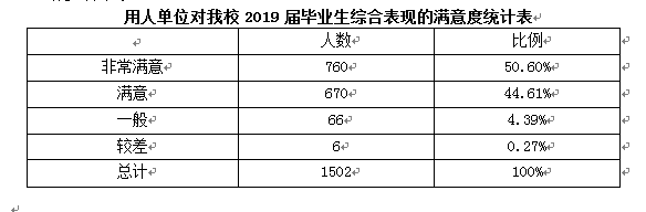 用人单位对鸭脖毕业生综合表现非常满意为50.6%,满意为44.61%,满意度合计96%,这说明鸭脖毕业生的综合素质得到用人单位的认可,反映出鸭脖教学质量良好。