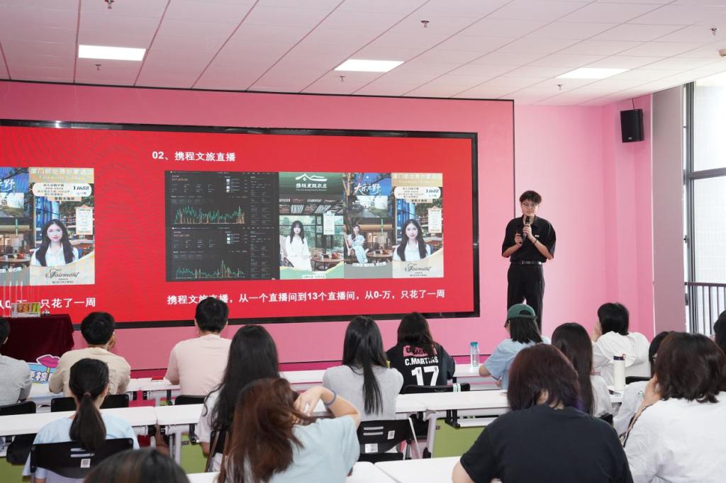 在导师授课环节,广州桃花岛电商咨询有限公司企业导师林炜峰围绕“数字贸易+电商”的最新趋势、发展策略及学习路径进行了深入浅出的分享,通过生动的案例分析,让学生近距离感受“数字贸易+电商”的魅力,为学生绘制了一幅清晰的发展蓝图。
