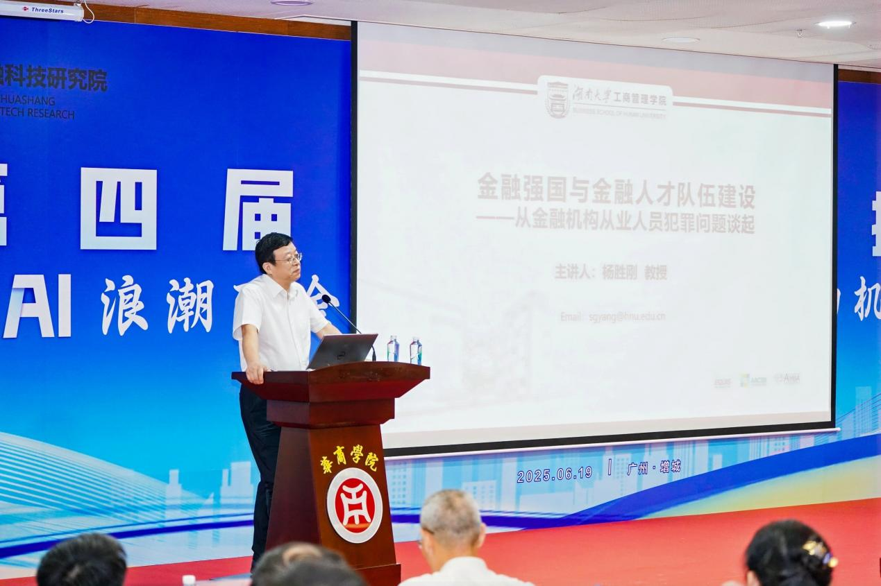 第三场主旨演讲由湖南大学工商管理学院教授、博士生导师,原湖南大学副校长,湖南大学金融发展与信用管理研究中心主任兼首席专家杨胜刚教授主讲,主题为“金融强国与金融人才职业修养”。杨教授强调,建设金融强国亟需高素质的金融人才。他系统分析了金融从业人员的职业伦理与合规风险,指出了当前金融犯罪的多发原因及其特征,并提出应从“不想犯、不敢犯、不能犯”三方面入手,有效遏制金融犯罪。杨教授还呼吁高校加强金融法治、职业道德及风险意识教育,以全面提升金融从业者的职业修养。