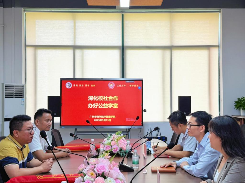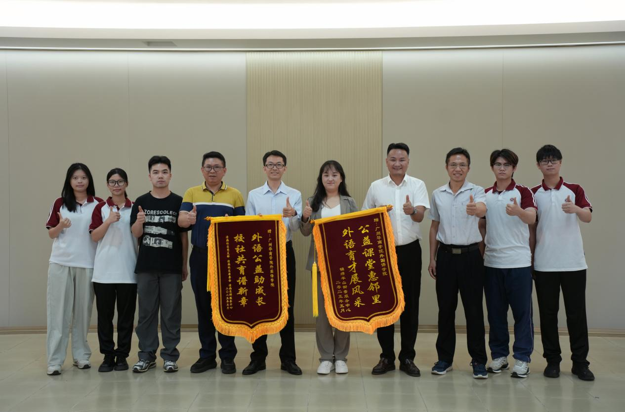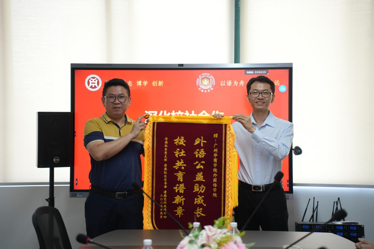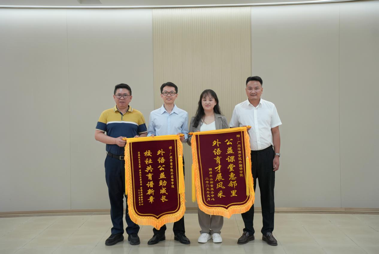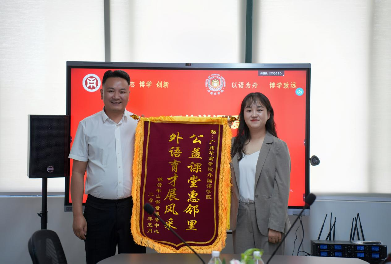 5月13日上午,yabo鸭脖官网外国语学院与增城区清燕社区、锦绣半山御景花园小区物业联合举办的“晚风学堂”英语晚辅公益项目赠锦旗仪式在创新楼403-2小会议室举行。清燕社区邓镜波书记、锦绣半山御景花园小区物业陈勇经理、外国语学院何顺发副院长及“晚风学堂”项目组全体成员共同见证这一校社协同育人的温暖时刻。“晚风学堂”不仅体现了外院学子践行社会责任的热忱,更是校社双向奔赴、共筑教育公益新模式的生动缩影。