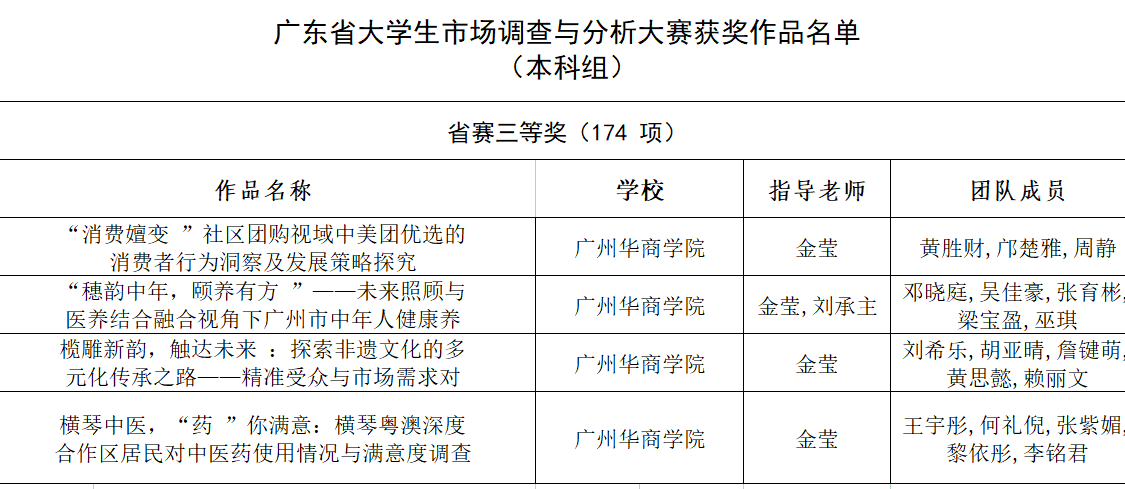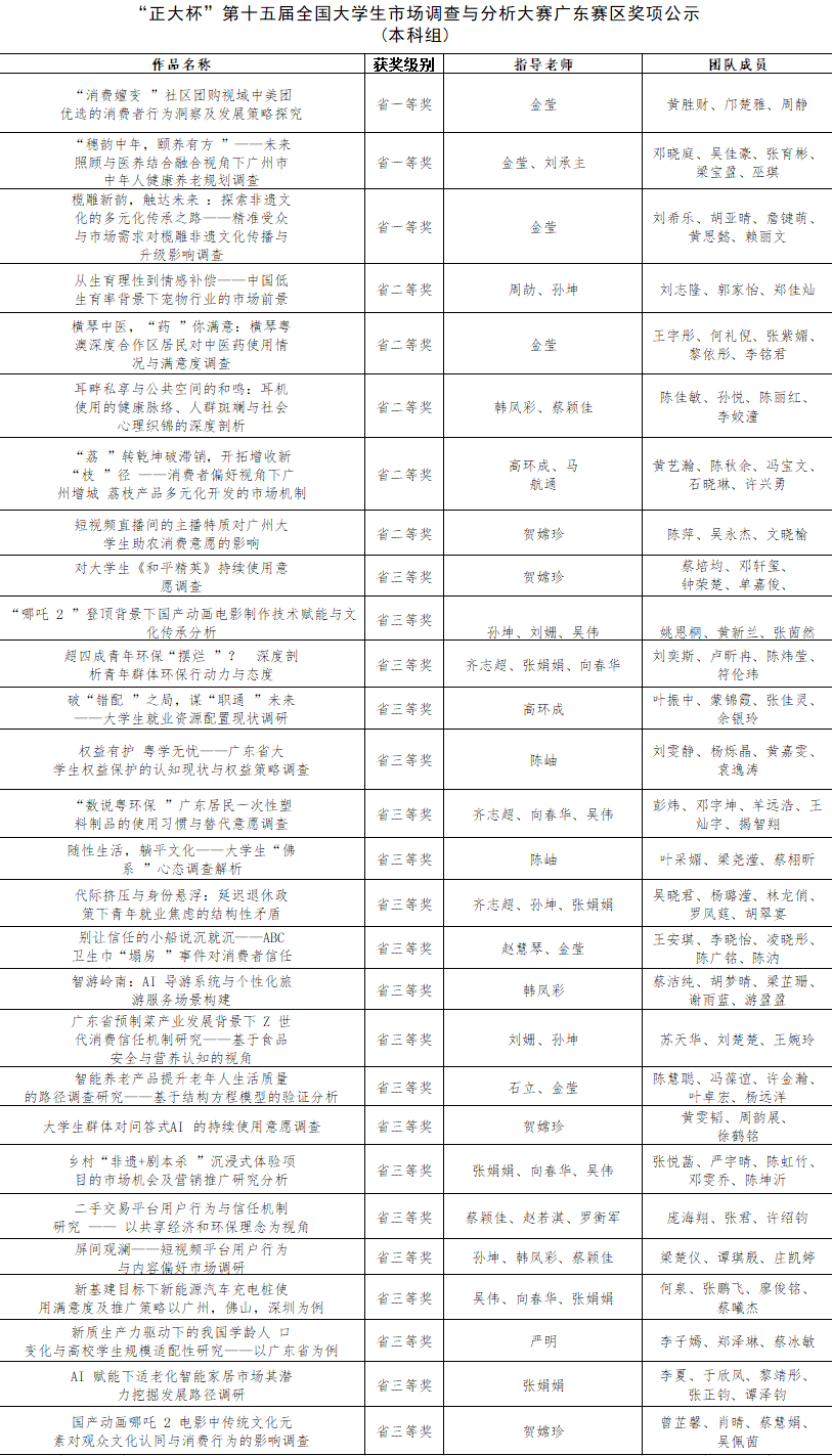 获奖层级实现全面突破。在激烈竞争中,鸭脖团队脱颖而出,荣获省一等奖3项:聚焦“非遗传承”“智慧养老”“消费行为”等前沿课题,作品深度与创新性获评委会高度认可;荣获省二等奖5项:覆盖环保行动力、中医药发展、乡村振兴等社会热点,体现实践与理论的紧密结合;荣获省三等奖20项:从“青年就业焦虑”到“新能源汽车推广”,选题多元且紧贴时代脉搏。此外,在广东省专项赛中,鸭脖4支队伍再添三等奖,进一步夯实了学科竞赛的“硬实力”。