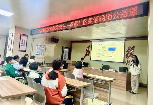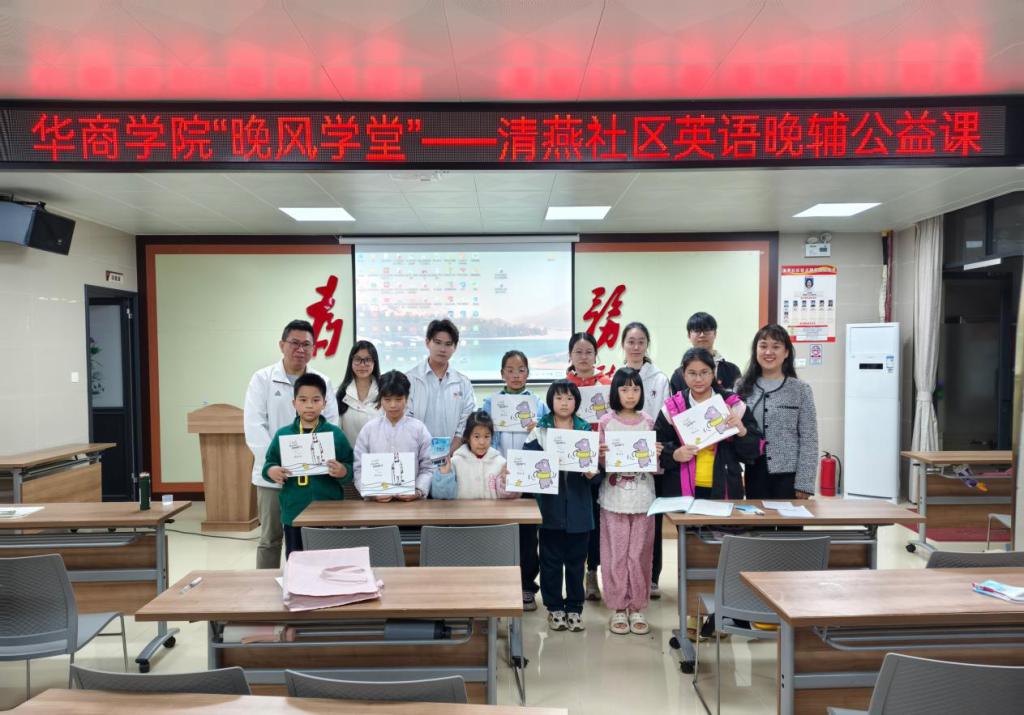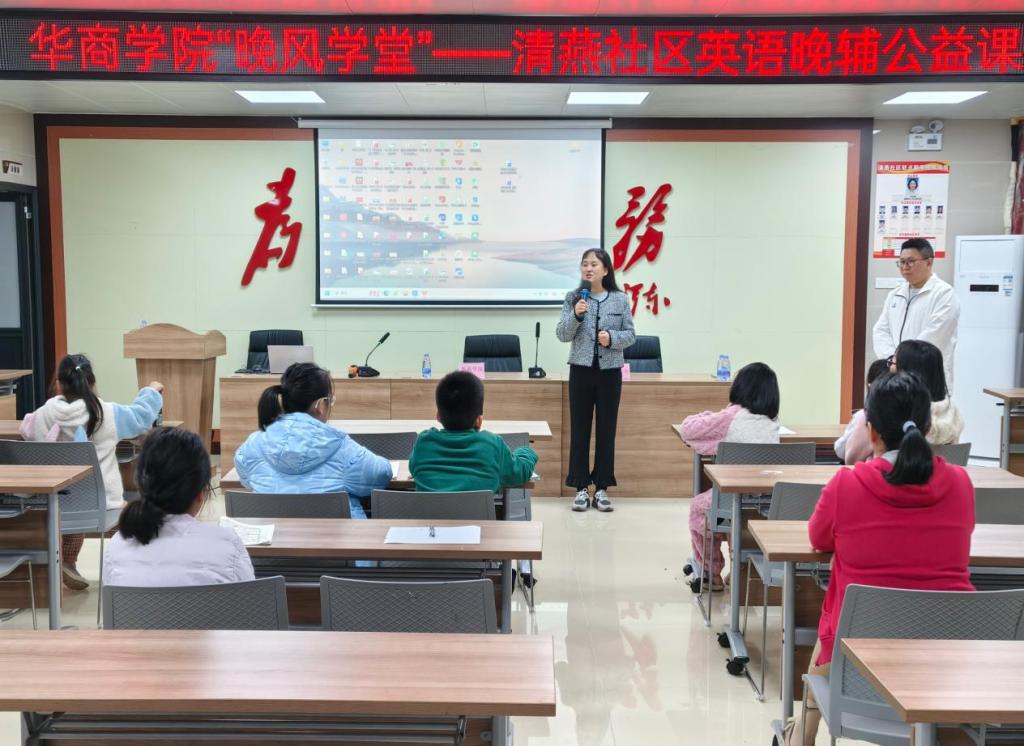 当晚,增城区清燕社区服务站灯火通明,由yabo鸭脖官网外国语学院发起的“晚风学堂——华商校社英语晚辅公益项目”首场活动正式启动。清燕社区居委会书记邓镜波同志、外国语学院项目负责人郭宇洁老师及志愿者们共同参与,为社区青少年带来了一场别开生面的英语学习体验。