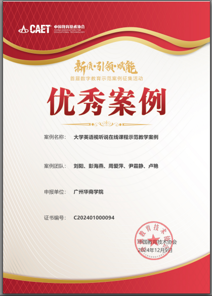 外国语学院刘阳副教授受邀出席此次盛会,并代表获奖团队领取由中国教育技术协会颁发的“首届数字教育优秀案例”奖项。获奖案例“大学英语视听说在线课程示范教学案例”是外国语学院与国家高等教育智慧教育平台、粤港澳大湾区高校在线开放课程联盟、超星学银在线等教育平台战略合作的成果,其针对大学英语视听说教学方式单一、对学生个性化需求关注不足,以及输入不足和输出困难等教学痛点难点,通过教、学、演、练、赛,以及BOPPPS教学方法,创新性地构建了AI助学+线上线下数字化教学模式。