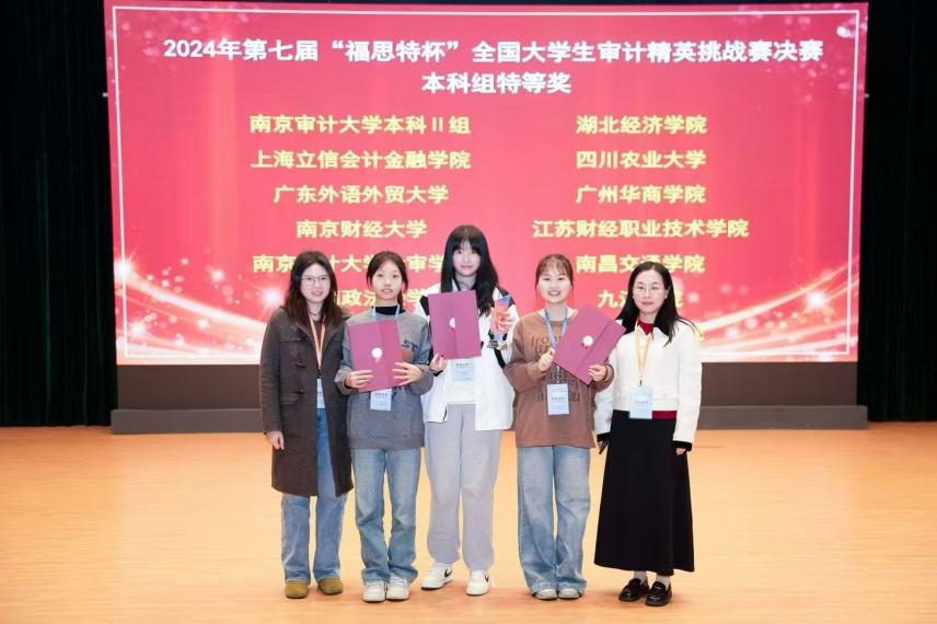 2024年11月30日,第七届“福思特杯”全国大学生审计精英挑战赛在南京审计大学圆满落幕。经过初赛、复赛、决赛的激烈角逐,鸭脖会计学院审计系马玉娟老师、张丽老师、彭司晨老师指导的2022级本科生苏琳雁、甘悦茹、黄锦贤获得本科生组特等奖。
