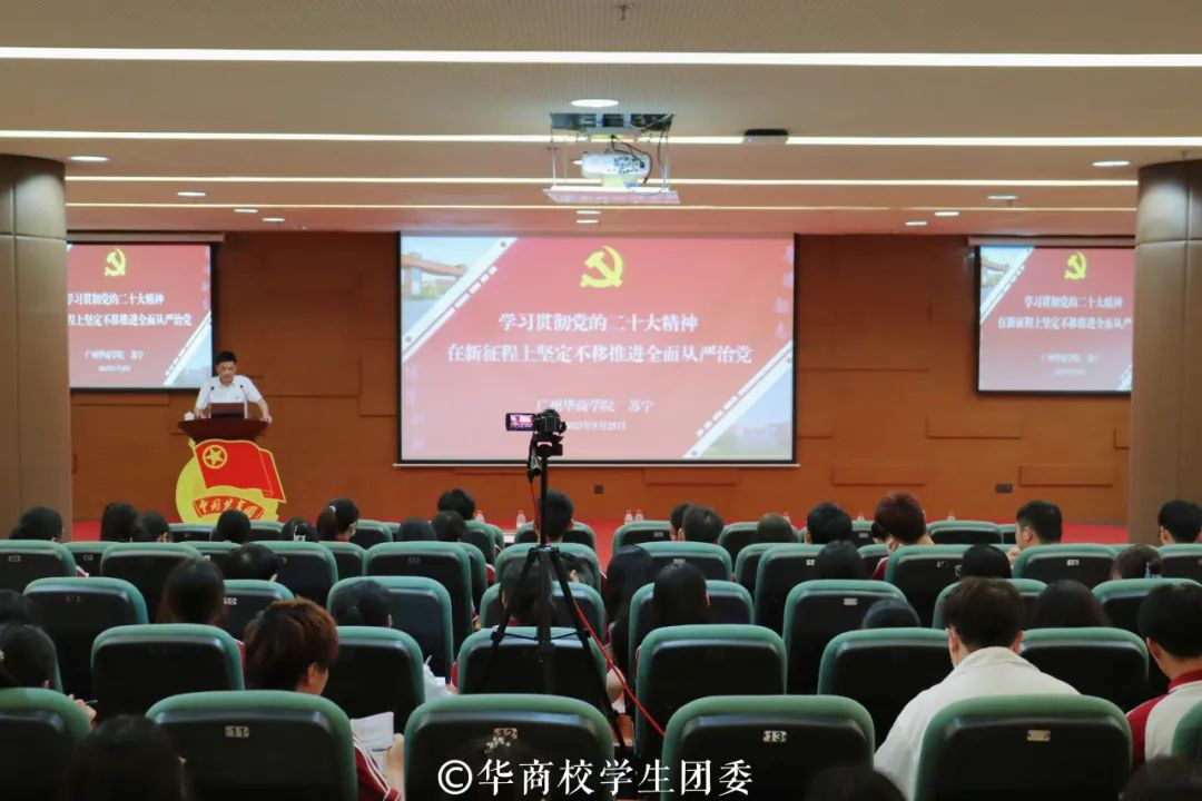 开班仪式结束后,学校党委苏宁书记以《学习贯彻党的二十大精神,在新征程上坚定不移推进全面从严治党》为主题进行授课。苏书记结合党的二十大报告对坚定不移全面从严治党、深入推进新时代党的建设新的伟大工程作出的重大部署,为大家梳理全面从严治党涉及的七个方面。他反复强调,全面建设社会主义现代化国家、全面推进中华民族伟大复兴,关键在党。习近平总书记站在巩固党长期执政地位的战略高度,精辟分析了大党独有难题的形成原因、主要表现和破解之道,强调要在新时代新征程一刻不停推进全面从严治党,健全全面从严治党体系。最后,他鼓励大家,身为新时代青年学生骨干,要深刻把握党的二十大作出的战略部署,要深入学习贯彻党的二十大精神,领会习近平总书记关于青年工作的重要思想,贯通学习领会,坚决抓好落实,持之以恒推动全面从严治党取得新成效,为实现新时代新征程党的使命任务提供坚强保障。