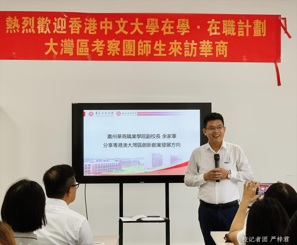 广州华商职业学院副校长余家军向港中文考察团分享粤港澳大湾区创新创业发展方向。他提到,大湾区政府高度重视青年的创新创业,华商学院创新创业孵化基地得到广州市政府的大力支持,表明本校学生在创新创业方面具有一定特色和优势。同时,学校为支持学生创新创业,已开设具有广东省一流本科水平的创业管理课程,并出台一系列政策支持学生创新创业,鼓励学生不仅注重学科竞赛,还要走出校门,增强实践能力,展现大湾区学生的风采。余家军副校长表示,港中文的学生拥有不同的文化背景,对市场的理解各不相同,他相信,在港中文学生进一步了解大湾区文化后,利用语言优势、地理优势,结合港中文优越的教学资源,作为个体必能把握大湾区,放眼全球。