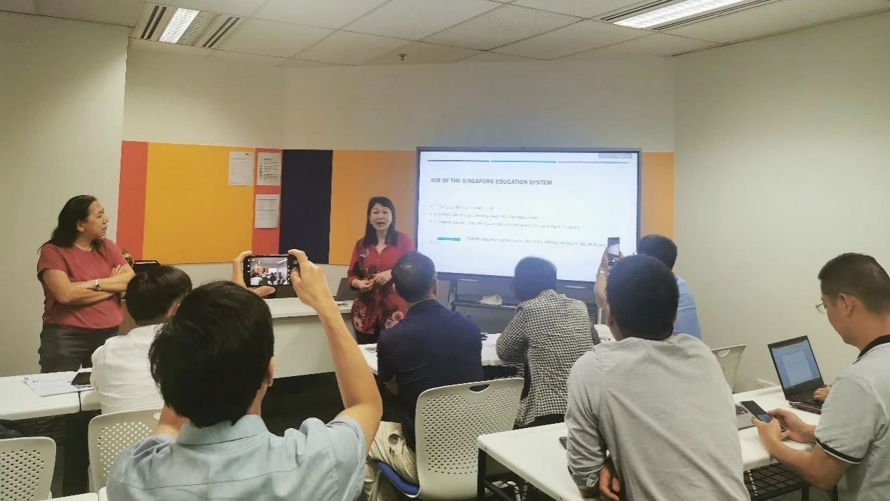 EIS负责人Marhaini和MsChee Meichun女士共同带来了主题为《新加坡教育体系介绍》的讲座。两位主讲人详细介绍了新加坡的整个教育体系及其教育理念。在大学教育方面,两位主讲人向访学团教师介绍新加坡五所公立大学和一所私立大学的各自特色和优势。讲座过程中,访学团教师与主讲人积极互动,共同探讨教育体制在学生成长成才中的重要作用,探讨两国教育体系的异同与特色。讲座结束后,支戈壁副校长对两位主讲人细致专业的讲解表示衷心的感谢,并赠予纪念品。