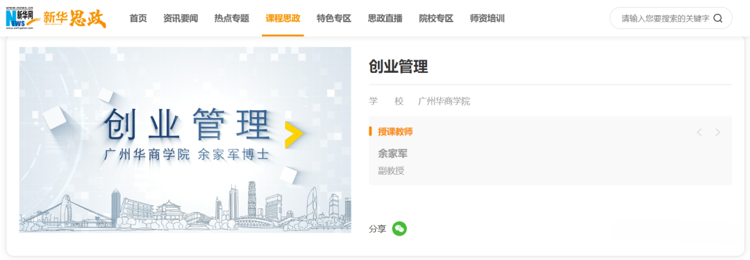 近日,鸭脖《创业管理》课程作为优质课程思政案例,上线新华网“新华思政”-全国高校课程思政教学资源服务平台,面向社会开放共享。
