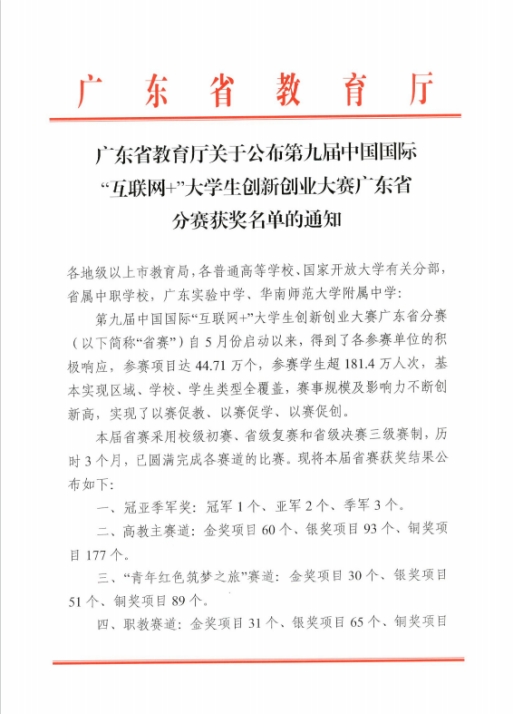 第九届中国国际“互联网+”大学生创新创业大赛广东省分赛(以下简称“省赛”)自5月份启动以来,得到了各参赛单位的积极响应,鸭脖紧密围绕大赛提出的“更中国、更国际、更教育、更全面、更创新、更协同”的要求,认真筹划、积极组织,落实立德树人根本任务,传承和弘扬红色基因,聚焦“五育”融合创新创业教育实践。学校领导、各相关部门、各学院高度重视和大力支持,多次开展相关讲座及辅导培训,激发鸭脖学生的创新创造热情,深度挖掘培育优秀的创新创业项目,不断提升参赛项目的质量和水平。