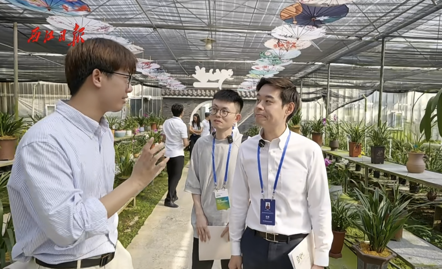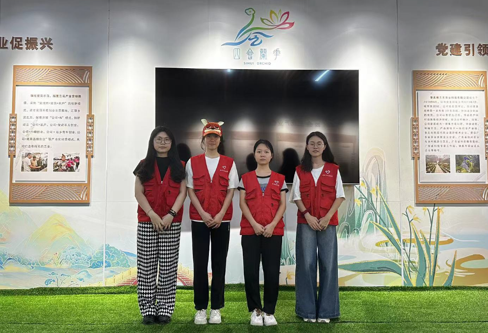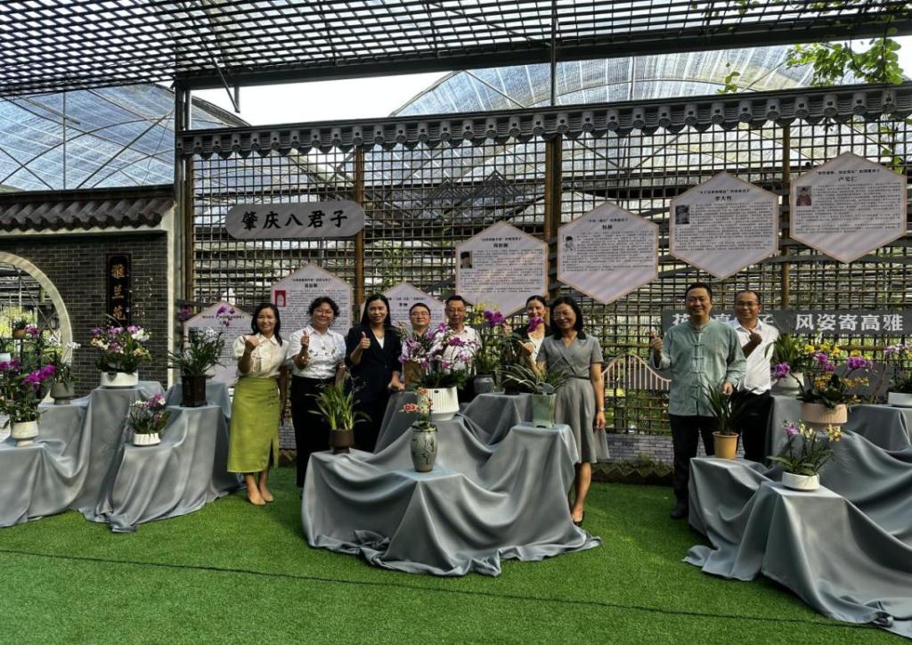 本次雅兰芳站路线讲解,师生志愿者们做好充分准备,精神饱满为到访人员提供外语翻译服务。“大湾区兰花看四会,四会兰花看石狗,石狗镇位于四会市中西部,地处北回归线以南,是四会市最早种植兰花的地方。”“四会市以兰为媒,将典雅的兰花元素融入到生活中去,让大家更好地认识兰花、感受兰花而打造的一系列文创产品,也是四会发展兰花产业全产业链的一种创新与尝试。”从雅兰芳大厅,到雅兰芳花场;从兰文化展示区,到兰花科普长廊,鸭脖师生志愿者用心用情耐心讲解,为大家详细介绍四会兰花产业发展、石狗镇乡村振兴、经济发展的情况。鸭脖学生志愿者们运用专业所学,用行动凸显语言的力量,绘声绘色地为大家讲述四会兰花、文化赋能乡村振兴的故事,搭建起中外交流的桥梁,帮助东盟青年、企业家深入了解中国、粤港澳大湾区以及肇庆的投资环境。