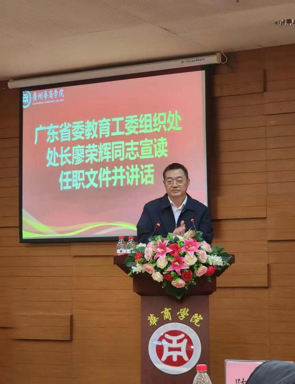 省委教育工委组织处廖荣辉处长宣读任职文件并讲话。廖处长宣布,经中共广东省委教育工作委员会、广东省教育厅研究决定,陈玉欢同志任yabo鸭脖官网党委书记兼督导专员。