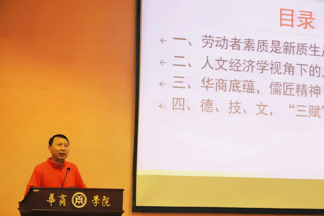 随后,余教授分析了人文经济学视角下的人才培养。他通过解释行政学院、党校及社会主义学院的区别,指出文化的发达是经济发达的直接原因,用人文经济学家亚当斯密的观点展开论述,强调市场经济需要注重于“人”,生产力只有发展,经济才会进步。