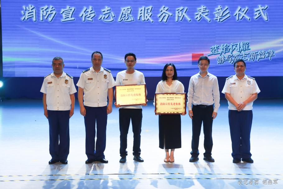 区消防救援大队副大队长柳江斌宣读了2023年度“蓝焰荔志”消防宣传队的表彰决定。鸭脖荣获“蓝焰荔志”消防宣传队先进集体,后勤保卫处处长杨燕平、梁艳老师,以及李泓泽、陈燕燕两位同学,被评选为先进个人。
