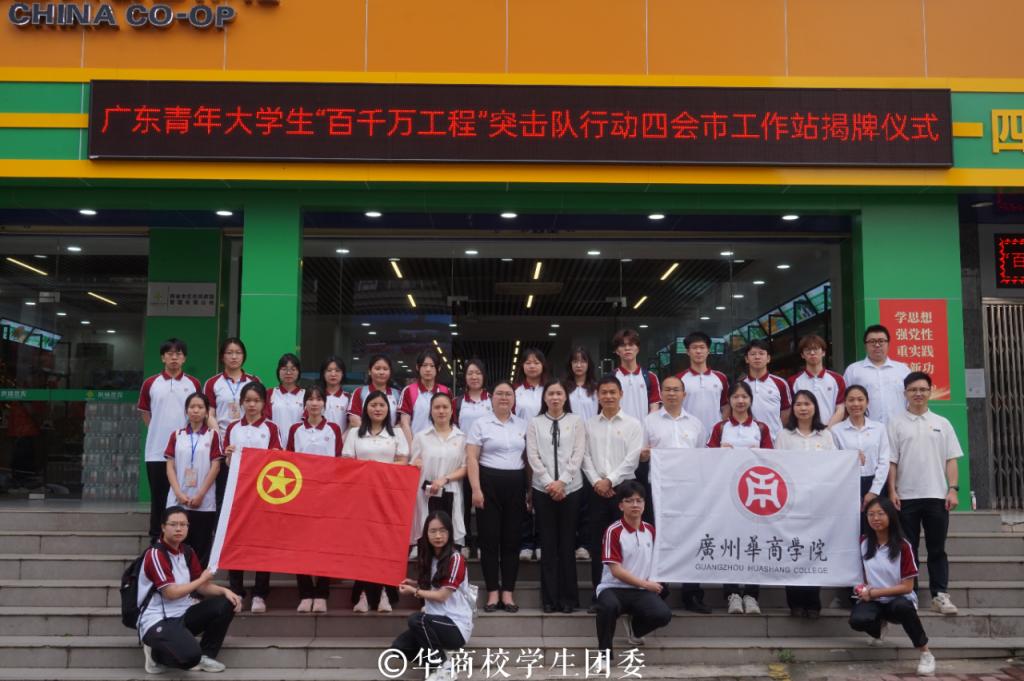 5月11日上午,在四会市委、市政府的统筹部署及团肇庆市委的指导下,团四会市委联合四会市供销社、佛山市驻黄田镇帮镇扶村工作队打造的全省首个广东青年大学生“百千万工程”突击队行动县级工作站(四会市工作站)正式揭牌投用。四会市委副书记吴鋆、佛山市驻肇庆帮扶指挥部、团肇庆市委、团四会市委、佛山市禅城区驻四会市帮扶工作组、四会市供销社、黄田镇人民政府等相关负责同志共同为广东青年大学生“百千万工程”突击队行动四会市工作站揭牌。校团委陈巧巧老师带领50余名鸭脖肇庆校区百千万工程突击队队员、青马班学员、青年团员代表正式入驻工作站开启首场直播。