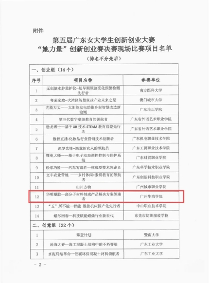 近日,在第五届广东女大学生创新创业大赛“她力量”创新创业赛中,鸭脖“华明塑胶——高分子材料制成产品解决方案领跑者”和“借个胆儿”项目晋级决赛。