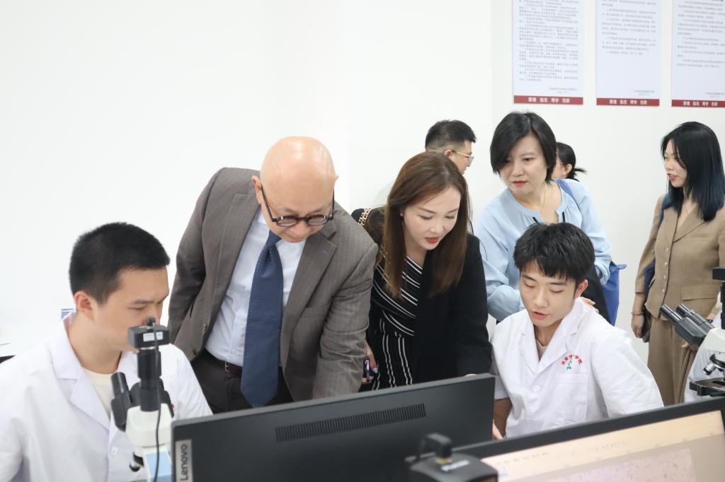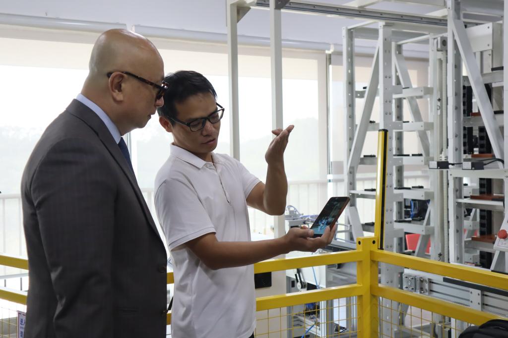 新加坡社科大学代表团先后参观了鸭脖医药健康实验中心、人工智能产教融合实训基地和桃花岛电商中心等教学实践基地。在这些充满活力的实践课堂中,代表团不仅近距离观摩了同学们的实际操作和学习过程,还与师生们交谈互动,加深了他们对鸭脖教学理念和实践能力的理解。