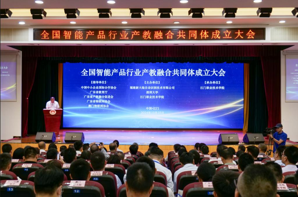 为了打造教育与产业深度融合的新典范,探索智能产品领域人才培养的新模式,推动产业链、创新链、教育链和人才链的有机衔接,为智能产品行业的持续发展和转型升级提供强大的人才支持和智力支持,根据中共中央办公厅、国务院办公厅、教育部的相关文件精神,由中国中小企业国际合作协会、广东省教育厅、广东省产教融合促进会、广东省物联网协会、澳门物联网协会等单位指导,由福建新大陆自动识别技术有限公司、深圳大学、江门职业技术学院等单位主办,江门职业技术学院承办的全国智能产品行业产教融合共同体成立大会正式召开。