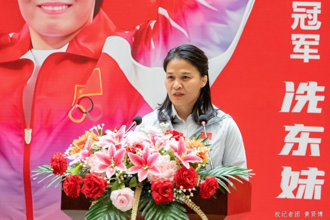 陈玉欢书记在讲话时,代表学校对冼东妹的到来致以热烈的欢迎和衷心的感谢。她称赞冼东妹是肇庆、四会人民的骄傲,是华商师生的荣幸,是女同胞学习的楷模,无论是体育成就还是领导力方面都值得学习,期望她能够培育出更多的世界冠军。陈书记指出,冠军走进校园,是学校充分发挥体育育人,发扬奥运精神的体现。今年是鸭脖迎二十周年校庆、迎本科教学工作合格评估的开局起步之年,希望全体华商人以冠军进校园活动为契机,通过“零距离”学习奥运冠军奋勇拼搏、为国争光的精神,努力把奥林匹克精神与追求卓越、推动学校高质量发展紧密结合起来,进一步坚定理想信念。