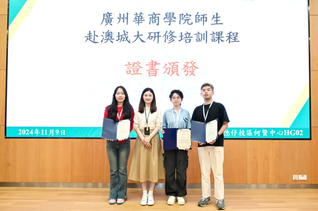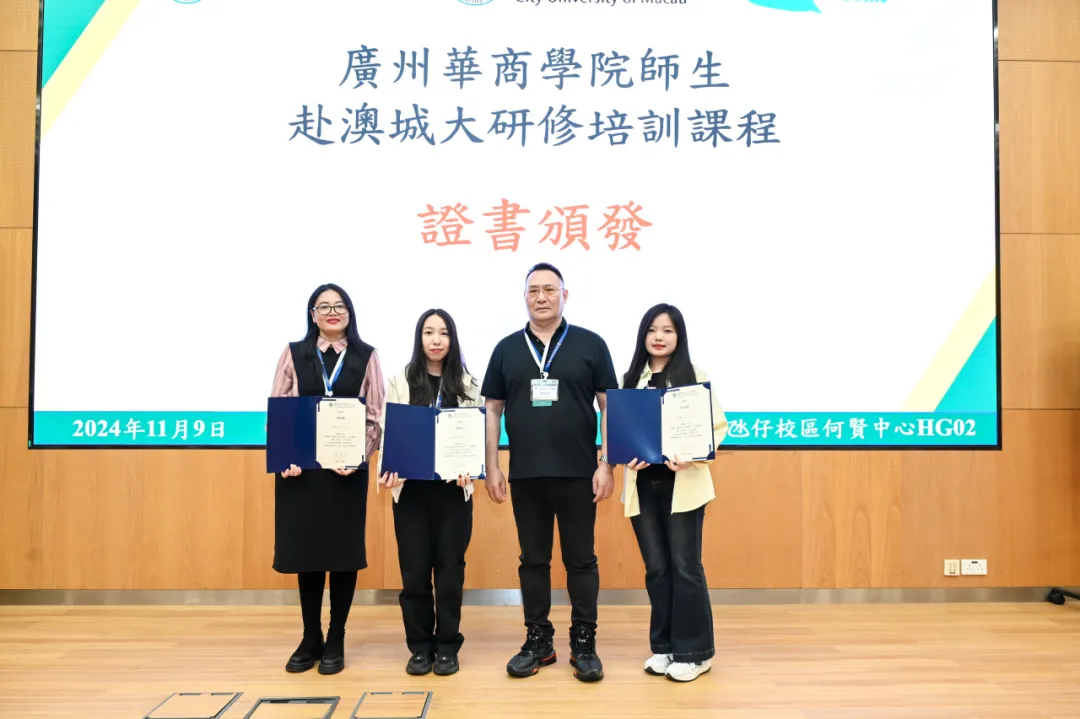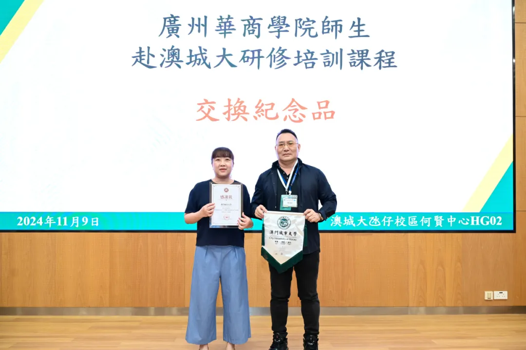 讲座结束后,澳门城市大学国际培训与测试中心为研学团队师生颁发课程结业证书,鸭脖与澳门城市大学国际培训与测试中心交换纪念品。