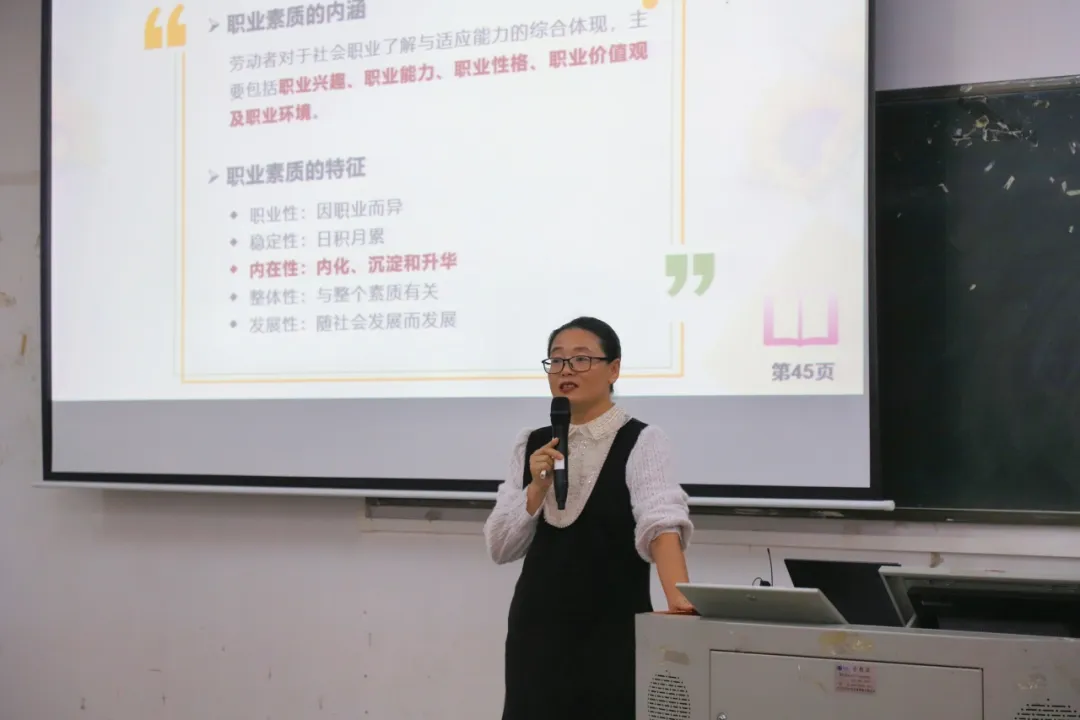 紧接着,高艳锋老师深入讲解了职业素质的培养。她详细阐述了职业素质的内涵,涵盖了职业兴趣、职业能力、职业性格、职业价值观以及职业环境等核心要素,探讨了职业素质的特征,包括其职业性、稳定性、内在性、整体性以及发展性。此外,她还详细介绍了职业素质的构成要素,为同学们提供了全面的职业素质培养框架。