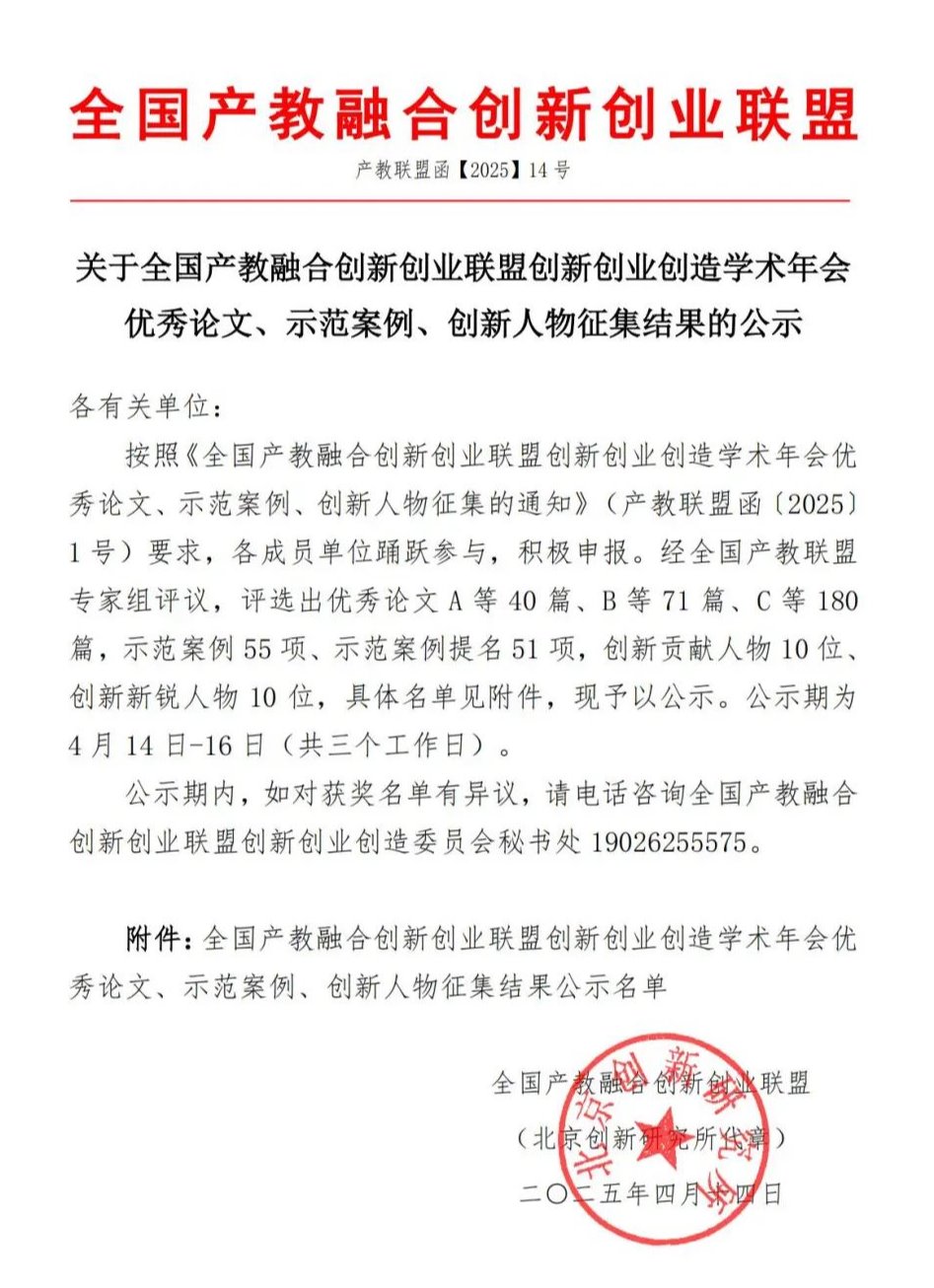 2025年4月14日,按照《全国产教融合创新创业联盟创新创业创造学术年会优秀论文、示范案例、创新人物征集的通知》(产教联盟函〔2025〕1号)文件通知,经全国产教联盟专家组评议,yabo鸭脖官网“借个胆儿——借个胆儿助力海胆产业一体化高质量发展”案例获评全国产教融合创新创业联盟创新创业创造学术年会示范案例,余家军教授获评全国产教融合创新创业联盟创新创业创造学术年会“创新新锐人物”。