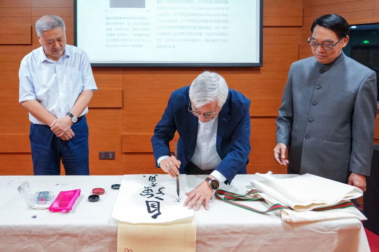 苏国辉院士挥毫赠与鸭脖墨宝,胡军校长代表学校向苏国辉院士赠送刺绣。