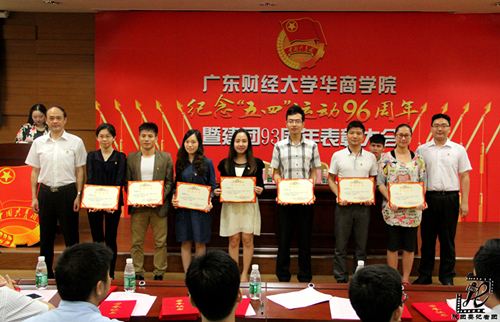 2015年5月11日下午,广东财经大学华商学院纪念“五四”运动96周年暨建团93周年表彰大会在中央图书馆报告厅隆重举行。学院党委书记苏宁,学院党委委员、团委书记杨宪以及团委常委、团委委员、学生组织(社团)指导老师、各校级学生组织正部长以上干部、各院系团总支副书记、学生分会正副主席、学生社团负责人、各院系团支书代表、团员代表、学生代表以及获奖人员代表共230余人出席大会。大会由学院团委副书记刘苗主持。