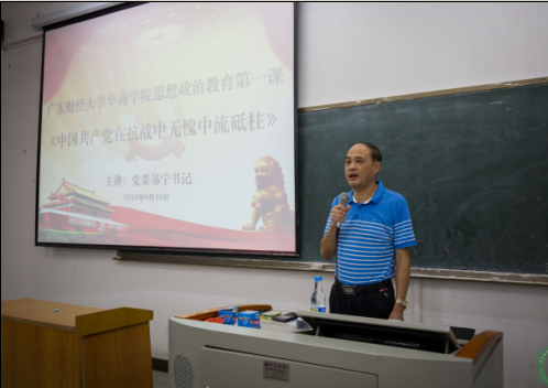 9月10日晚,广东财经大学华商学院党委书记苏宁在励志楼b102主讲了思想教育第一课《中国共产党在抗战中无愧中流砥柱》。